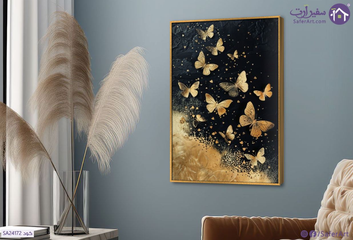 تابلوه مودرن فراشات ذهبى بتصميم مميز وجذاب لفراشات طائره بخلفيه بلون اسود, متوفر بمقاسات متعددة يمكنك اختيار او تغيير المقاس عند الطلب ,بتصميم مميز لـ تابلوهات مودرن, تابلوهات مودرن , لوحات فنية مودرن فراشات, حيوانات و طيور , التابلوه يغلب عليه الالوان اسود, اللون الواحد, فضى – ذهبى , و مصمم بالشكل التالى 1 قطعه , بالطول, ببرواز, برواز ذهبى, مستطيل , مناسب لديكور حوائط غرفة المعيشة, غرفة النوم, مكاتب – شركات - اعمال , و هو يتميز بالسمات التالية : ديجيتال آرت, لوحات فنية , متوفر الان فى مصر و يأتى جاهز للتركيب مع دليل التركيب و اكسسوارات التركيب اللازمه
